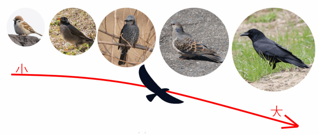 こんな風に大きさの基準となる鳥を『ものさし鳥』と言い、スズメ、ムクドリ、ヒヨドリ、ハト、カラスなどの普段からよく見る鳥が当てはまります。