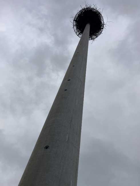 さて、現場のすぐ近くには、写真のようなコウノトリの人工営巣塔が立っています。