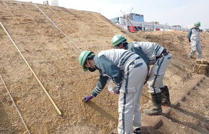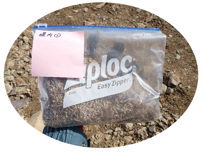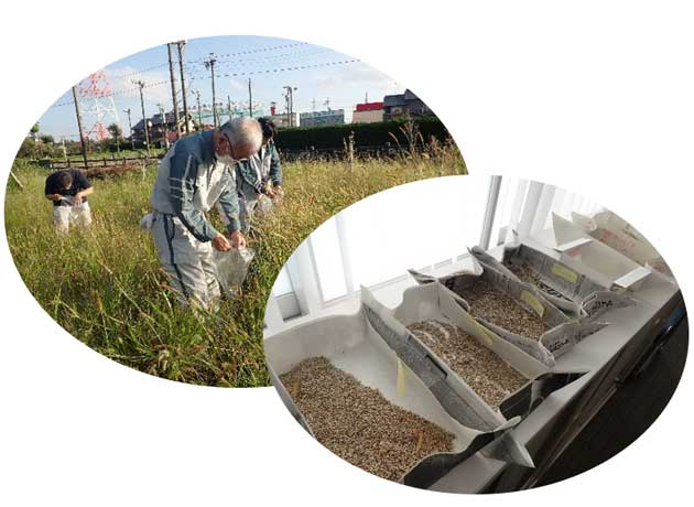 在来植物のタネをあらかじめ採取してストックしておき、堤防などの法面(のりめん)工事の際に、まくことで在来植物の数を増やすというもの。