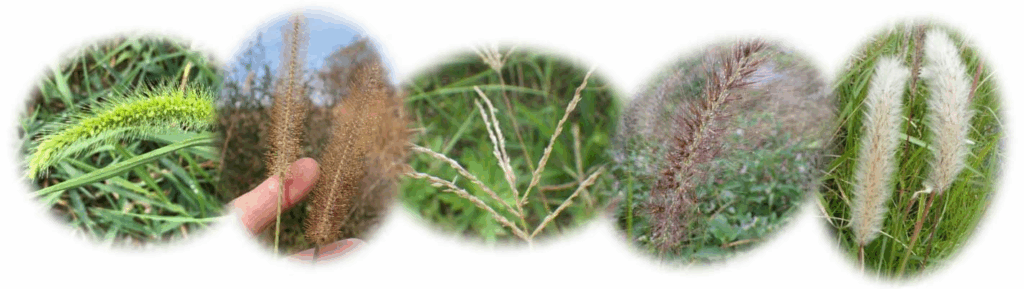 エノコログサ、キンエノコロ、メヒシバ、チカラシバ、チガヤ。