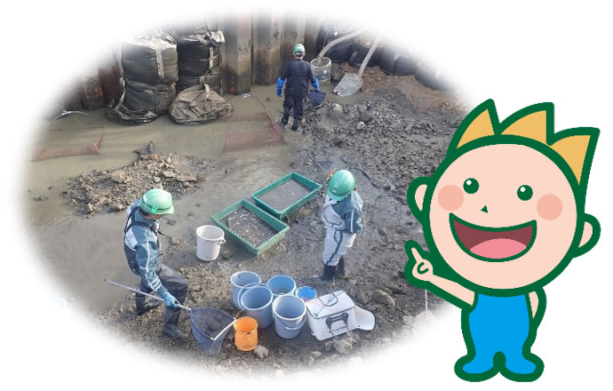 一見、生き物がいそうにない川も、水を抜くとたくさんの生き物が姿を現すので、気が抜けません!!