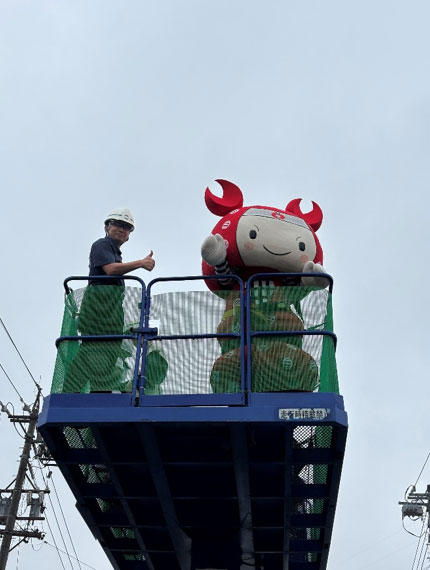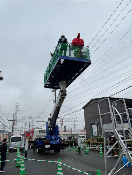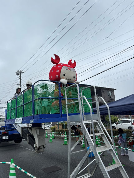 ちょき丸くんもしっかり安全帯を付けて、高所作業車に乗り込みます!!