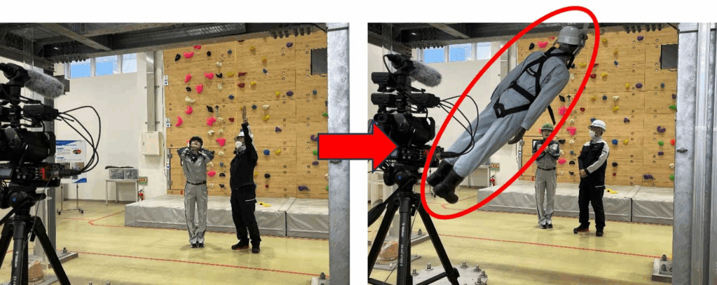 5mの高さから体重75kgの人形を落下させた時、フルハーネス型の安全帯にどのくらいの衝撃がかかるのか見てもらいました。