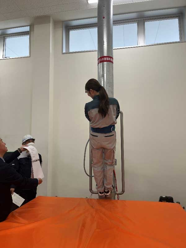 胴ベルト型安全帯の補助フックを取り付ける位置や、掛け替え時のリスク、墜落時の衝撃、驚きを体感する設備です!
