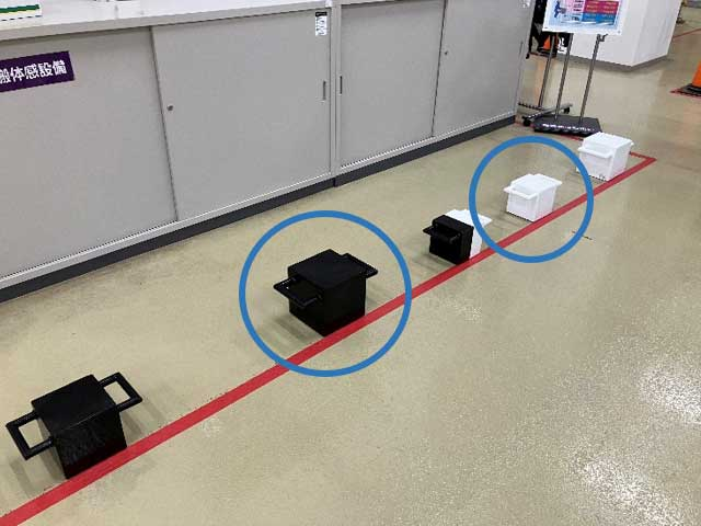 こちらは色と大きさが違う重量物を用いて、見た目で判断した時にどのようなことが起こりうるのか体感しもらう設備です!
