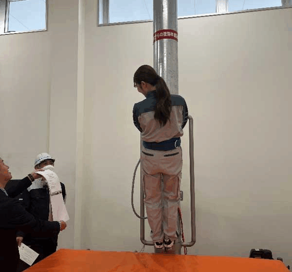 5mの高さから体重75kgの人形を落下させた時、フルハーネス型の安全帯にどのくらいの衝撃がかかるのか見てもらいました。