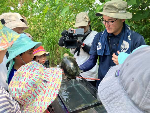 現場のエコミーティングの様子やビオトープを活用した自然観察会、エンディング撮影など。