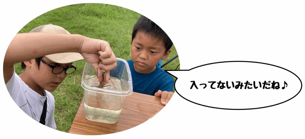 ハリガネムシが入っていないか、おしりを水につけて確認!!