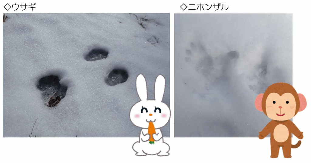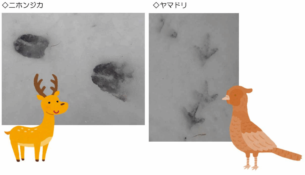 参考までに、以前スノートレッキングをした際に発見した動物たちの足跡をご紹介!