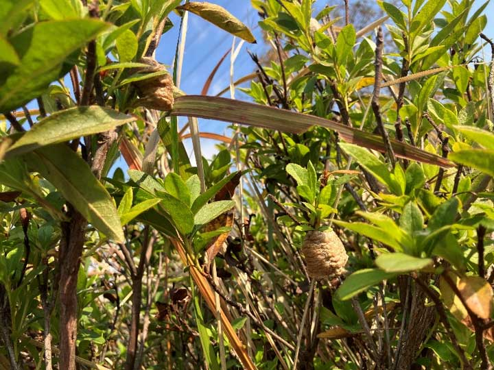 さて、草地エリアを見てみると、ツツジの木にオオカマキリの卵がたくさんついていました。
