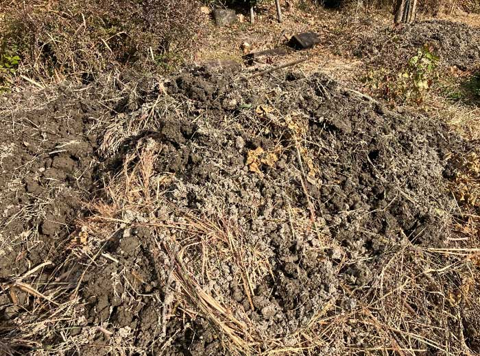 泥の中には植物の成長に必要な栄養分がたくさん含まれています。草と混ぜ合わせて、たい肥にします。