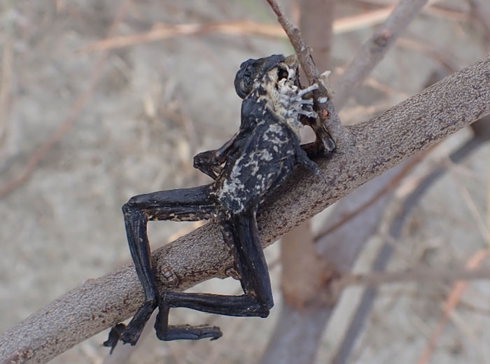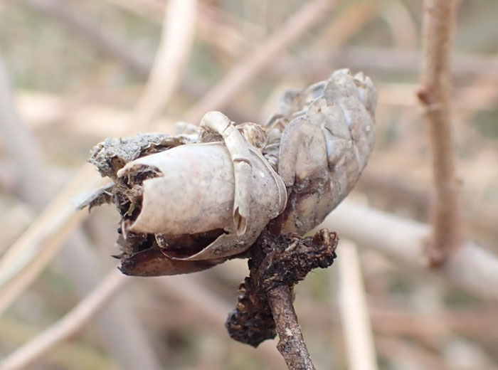 冬場のビオトープの風物詩といえば、『モズのはやにえ』。