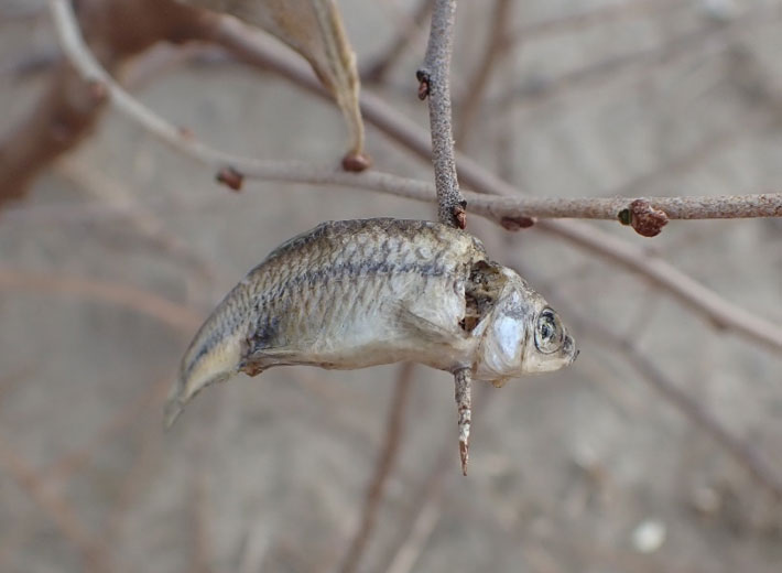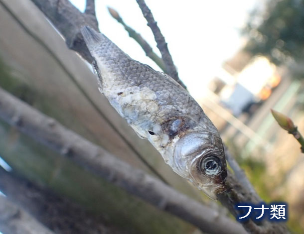 フナはウロコが硬かったのか、口から枝を刺しています。