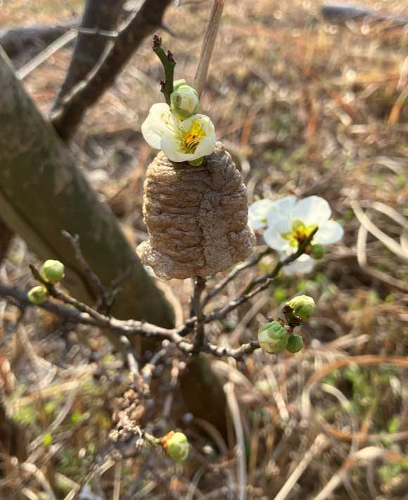 ウメの花をよく見ると・・・オオカマキリの卵のうの上から咲いていますよ!めでたい感じがしますね☆