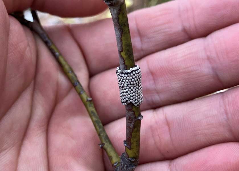 ウメの枝にぐるっと一周何かの卵が産みつけられています。こちらはオビカレハというガの卵です。