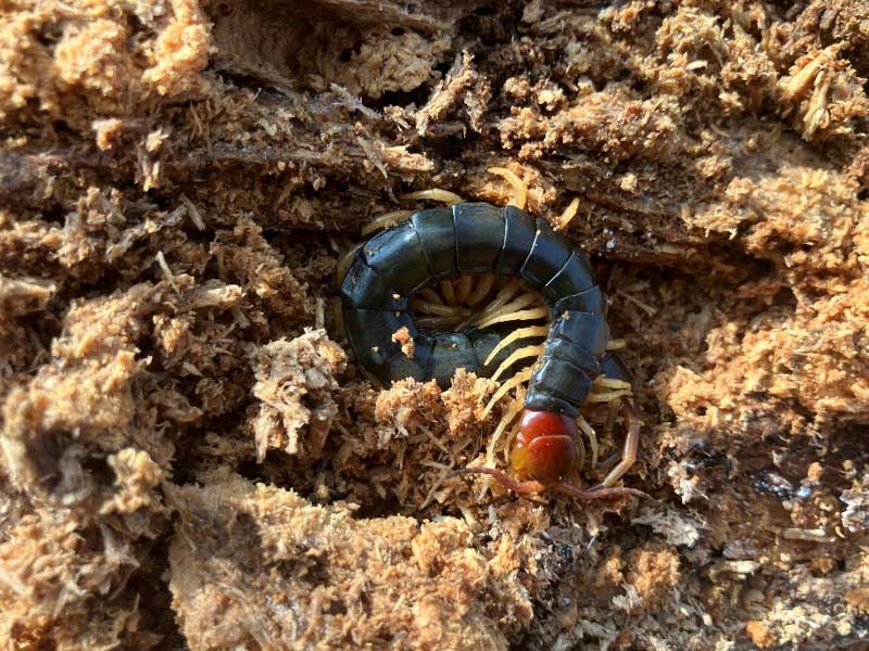 ぺりっと材の表面をめくると、大きなトビズムカデが越冬していました。
