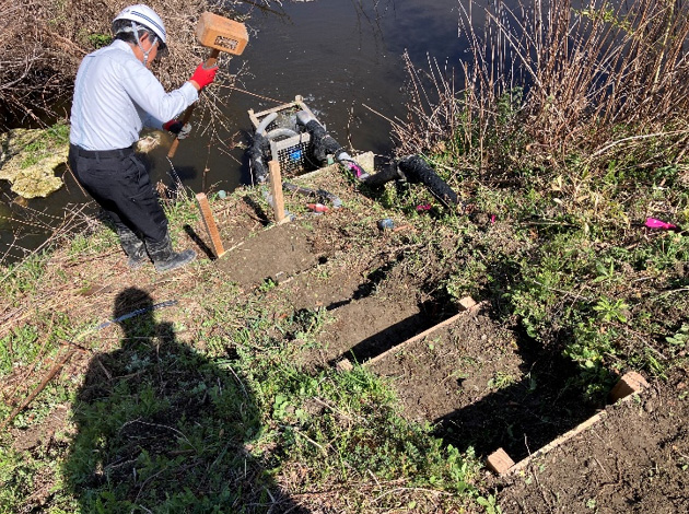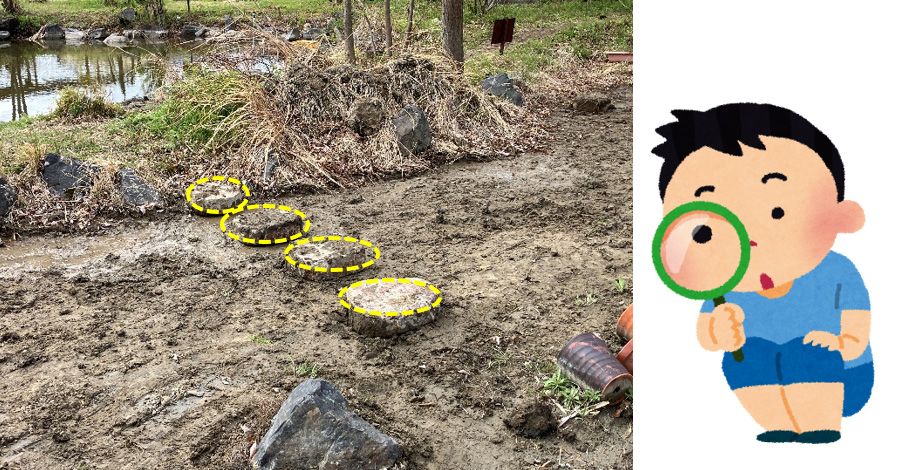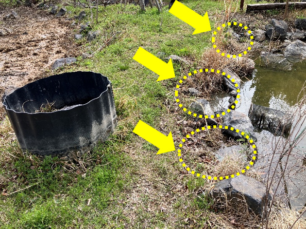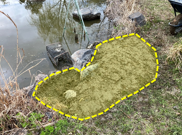 浚渫で発生した土を、削れた部分に投入して埋め戻しました。これで、安全に池をのぞき込むことができます。