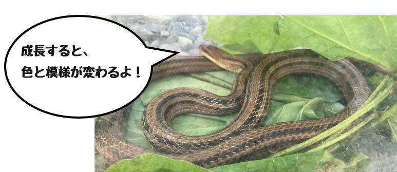 シマヘビは子供の頃は赤色で、模様も縞模様ではなく独特です。
