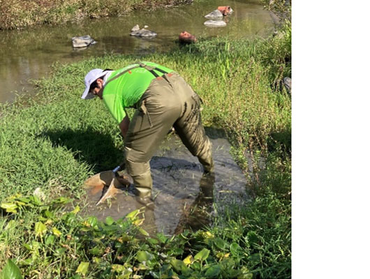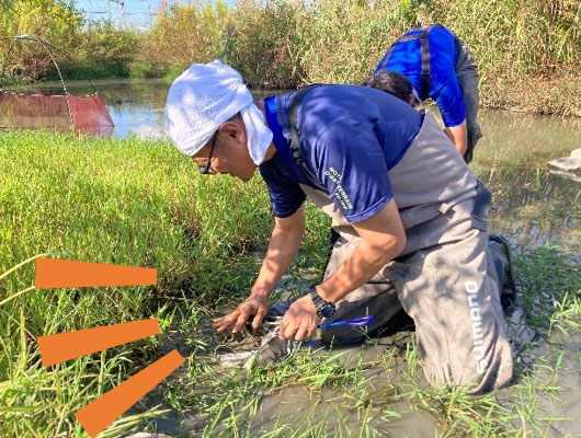 胴長ヨシッ! たも網ヨシッ! さっそく、調査開始!