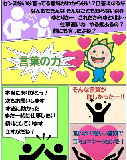 全社員に行ったアンケートを基に、言われて嬉しい言葉と嫌な言葉をたくさん入れ込んで漫画風にしてみました。