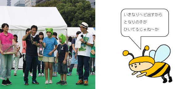スズメバチの巣やらヘビの脱皮ガラの展示の他、生きたシマヘビやアオダイショウ、ムカデにヤモリ…