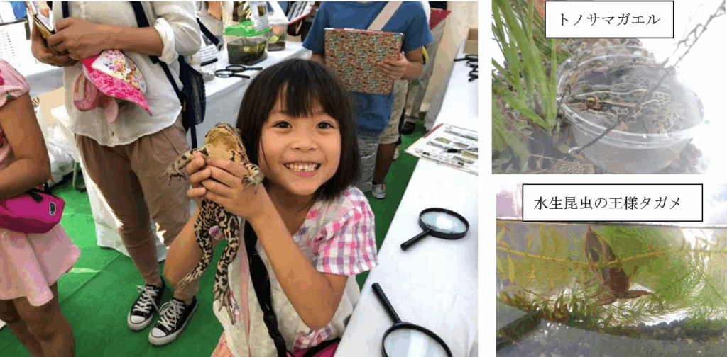 今回展示した生き物はシマヘビ、スッポン、トカゲ、ヤモリ、カエル(アズマヒキガエル、シュレーゲルアオガエル、トノサマガエル)、アカハライモリ、昆虫(タガメ、クモ、ムカデ、ヤスデ)などなど、色んな生き物にタッチできます。