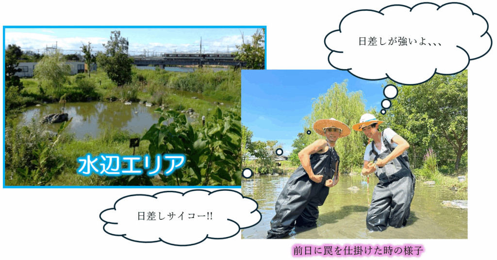 水辺エリアでは、たくさん捕れることを願いながら前日に罠を仕掛けました。