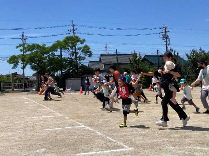 園児とその保護者が一緒に手をつないではぐれないように走ります♪