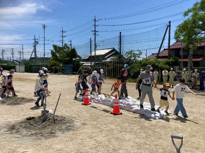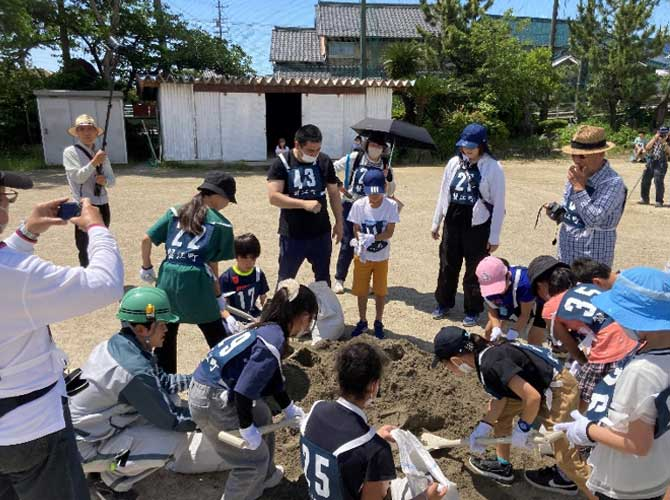 子どもたちと行政の職員の皆様、地元建設会社が一緒になって土のうを積む体験をしました!