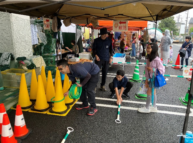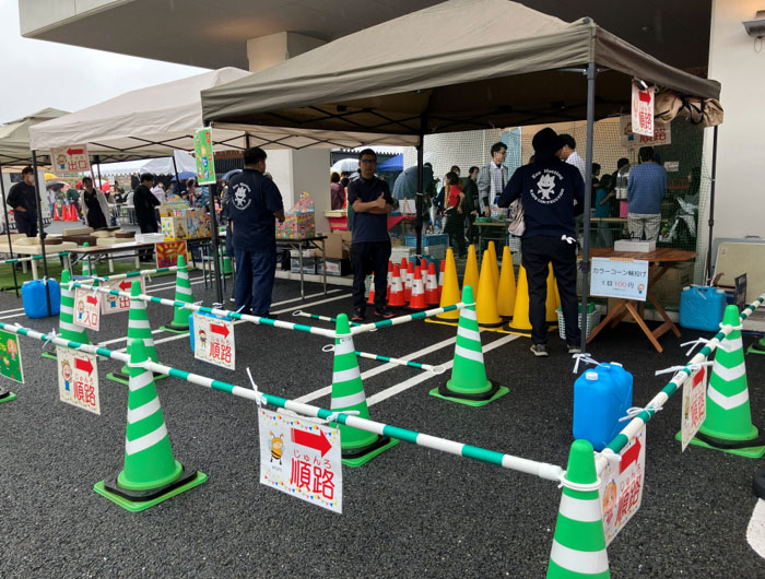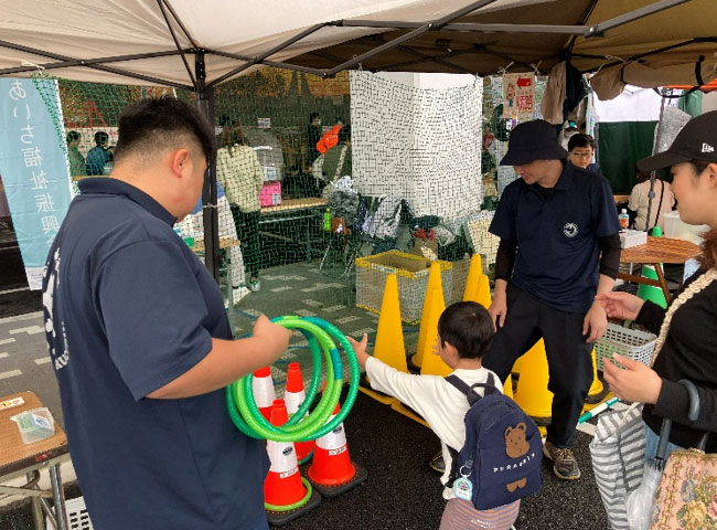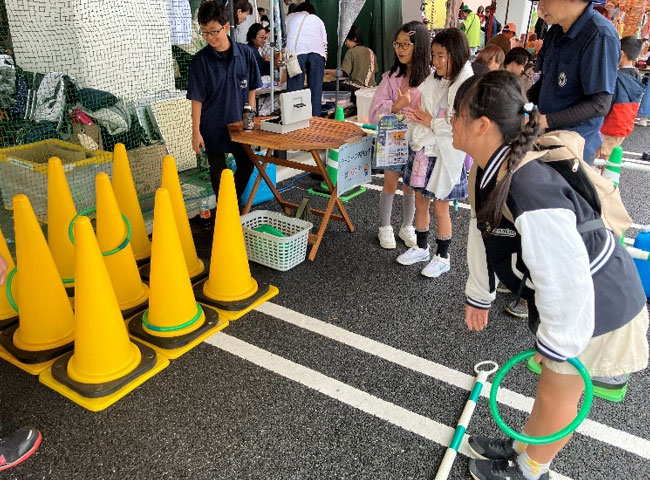 私たちのブースでは、毎度おなじみ「カラーコーン輪投げ」を実施。
