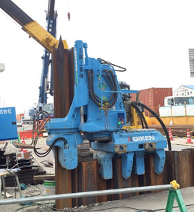 本来は13mの鋼矢板を一気に圧入するのですが、四角に囲う4辺のうち1辺は分割してました。