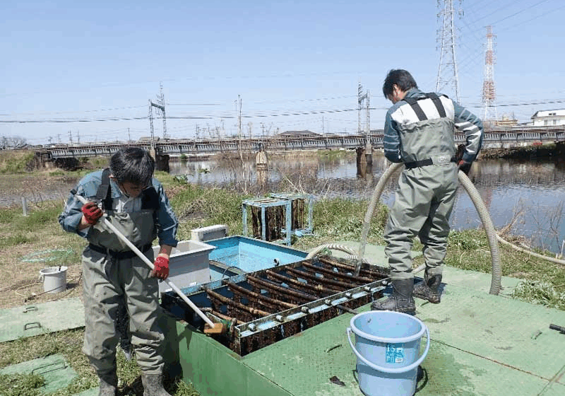 水中ポンプやたも網を使ってヘドロを取り除きます。