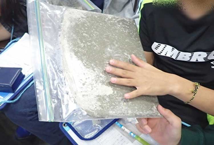 色々説明した後は、パワーブレンダーで改良する前と後の土を触ってもらいました。砂と粘土の2種類の土を用意!