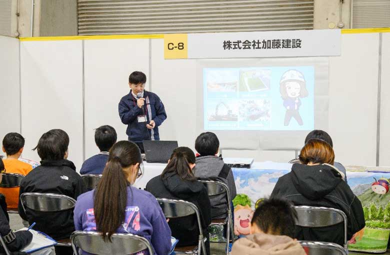 当社のブースでは「どんなものを作っているのかな?災害からみんなの命を守る建設のお仕事を見てみよう!」と題して、建設業の仕事や当社の仕事についてお話しました(*^^*)