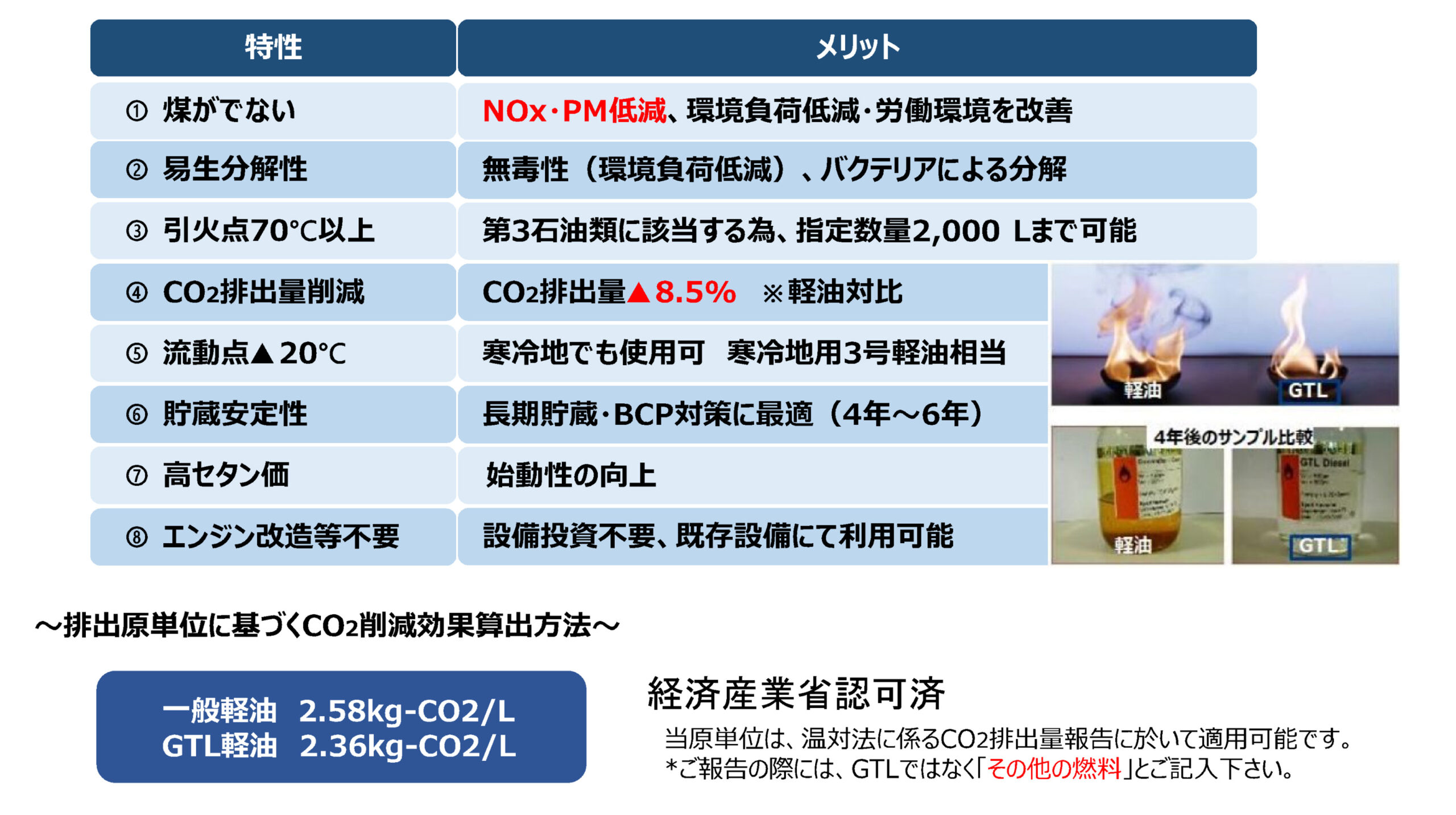 GTLとはGas to Liquidの略称であり、天然ガスから精製された液体燃料の総称です。硫黄分・金属分・芳香族分を含まない非毒性のパラフィン系燃料となります。軽油のJIS規格に合致しており、軽油代替燃料として使用が可能です。