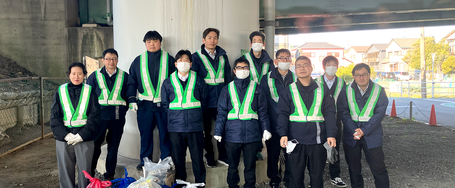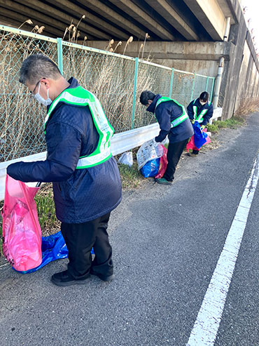私たち加藤建設は、本社西側を走る西尾張中央道の清掃ボランティア「スマイルクリーンズ」に参加して、毎月1回ゴミ拾いや除草作業を行っています。